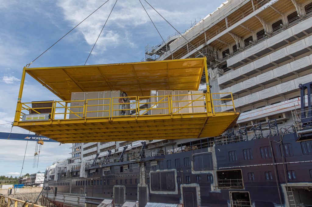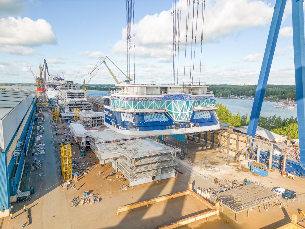 Wie schon ein aus den in der Karibik gedrehten Hollywood-Streifen bekannter Seefahrer feststellte, ist es nicht nur ein Kiel und ein Deck und ein Rumpf, was ein Schiff braucht, es ist das Gefühl von Freiheit, das es seinen Passagieren schenkt. Ein neues Maß an Freiraum und Wohlgefühl soll auch die Mein Schiff 7 ihren Gästen an Bord vermitteln. Vergangene Woche meisterten Schiffsbauer und zahlreiche Gewerke eine weitere Hürde auf dem Weg der Fertigstellung des jüngsten Schiffes der Wohlfühl-Flotte. Ein Ereignis jagt das nächste auf der Meyer Werft im finnischen Turku, wo die Mein Schiff 7, die im kommenden Jahr in Dienst gestellt werden soll, gegenwärtig gefertigt wird. Kürzlich gelang den Schiffsbauern in Zusammenarbeit mit allen beteiligten ExpertInnen vor Ort das Lifting des ikonischen Diamanten, der sich am Heck des Ozeanriesen befindet. Bewerkstelligt werden logistische Meisterleistung sowohl beim Aufsetzen des Diamanten als auch bei weiteren Block-Liftings, die gerade auf der Werft stattfinden. Wybcke Meier, CEO von TUI Cruises, zeigte sich anerkennend gegenüber der Leistungen der Profis vor Ort: „Die Meyer Werft beeindruckt uns wieder einmal mit Perfektion und Präzision. Wir freuen uns auf die weiteren Meilensteine, die bis zur Taufe noch vor uns liegen.“