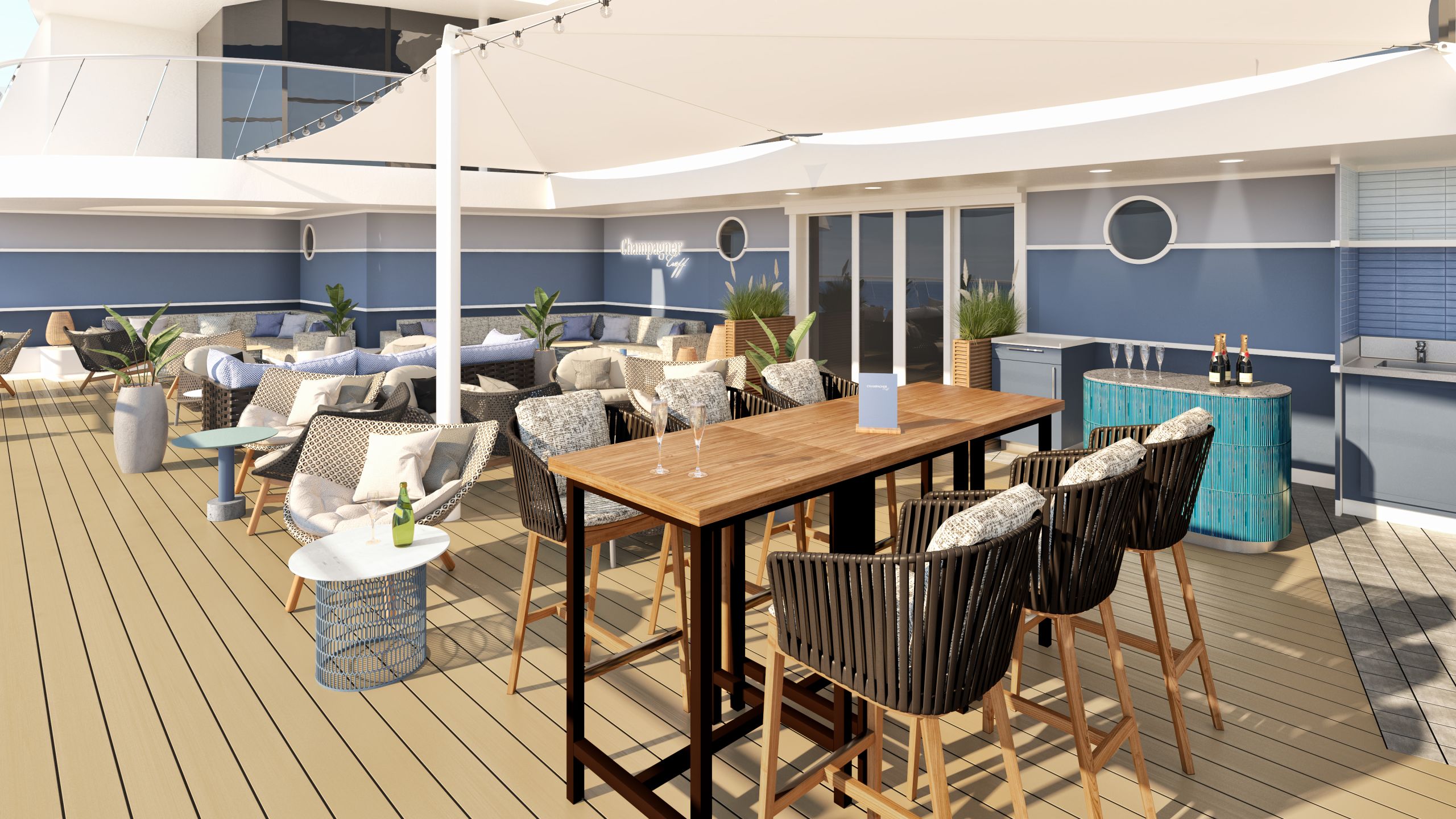 Diverse Leckereien erwarten die Passagiere im neuen Café auf Deck 5: Kaffee-, Gebäck- und Schokoladenspezialitäten werden in entspannter Atmosphäre serviert und können auch zum Mitnehmen erstanden werden. Im Heck des Schiffes soll das neue Asia & Sushi Restaurant untergebracht werden. Am offenen Tresen in der Mitte des Restaurants sollen die Gäste beobachten können, wie die variierenden Kreationen aus gesäuertem Reis, ergänzt um Zutaten wie rohen oder geräucherten Fisch, rohe Meeresfrüchte, Gemüse und Co zubereitet werden. Neben der japanischen Kulinarik darf die weltweit beliebte mediterrane Küche nicht zu kurz kommen. In dem italienischen Restaurant, das auf Deck 4 ebenfalls im Heck des Schiffes untergebracht ist, wird neben Pizza, Pasta und weiteren italienischen Gerichten ein exklusives Frühstück serviert. Die innenarchitektonische Kombination aus Holzfußboden, modernem Farbkonzept und großen Panoramafenstern, durch die nicht nur Licht einfällt, sondern auch ein weiter Meerblick ermöglicht wird, lädt zum Entspannen und Genießen ein.